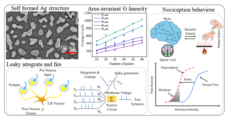 Device area invariant conductance linearity in scalable silver nanostructure based neuromorphic devices with threshold activation following nociceptive behavior