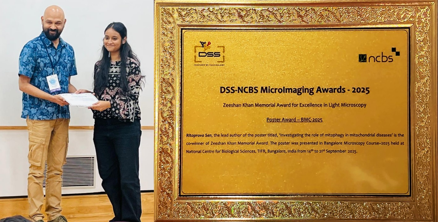 Ritoprova Sen was awarded Zeeshan Khan memorial Best Poster Award for her Poster “Investing the role of mitophagy in mitochondrial diseases” at the Bangalore Microscopy Course, 2025, held at National Centre for Biological Sciences, Bengaluru from 14-21 September, 2025.`