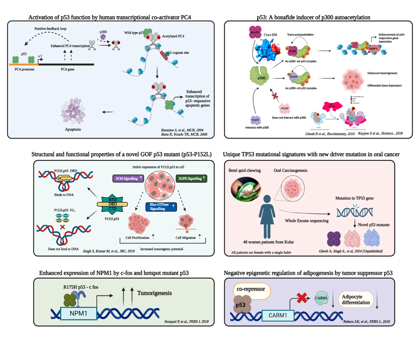 Wild-type p53 is regulated by coactivators like PC4 and p300. PC4 strongly interacts with p53 and plays a key role in p53 mediated apoptosis. Both wild type and mutant, is a bona fide inducer of p300 autoacetylation, thereby regulating the epigenetic landscape. Consistent with this, p53 activity is compromised in oral cancer either through mutations or changes in the status of p53 modulators. Missense mutations in TP53 can contribute to tumorigenesis through gain-of-function of biochemical and biological properties to contribute to oral oncogenesis.