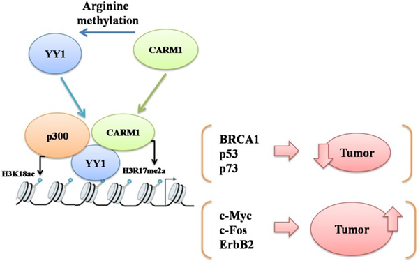 2. A schematic to explain probable mechanisms of co-operative action between YY1 and CARM1 to either suppress or promote carcinogenesis by upregulating either YY1 responsive tumor suppressor genes (such as BRCA1, p53 and p73) or YY1 responsive oncogenes (such as c-Myc, c-Fos and Erb B2) respectively. (Fig. Ref.: Behera AK et al., Oncotarget, 2019)