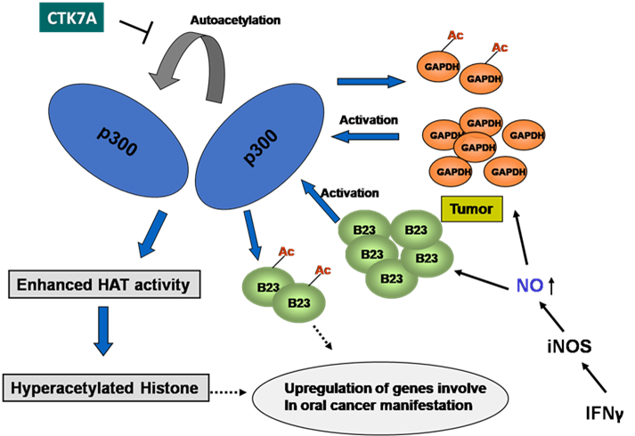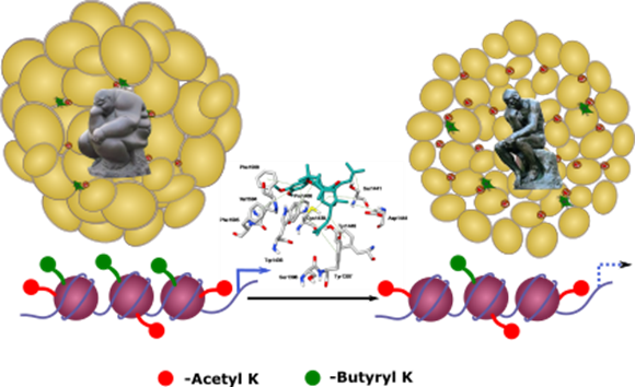 Through a rational design approach, the natural compound small molecule modulators of epigenetic enzymes (KATs) and derivatives of these molecules were tested in vitro and in vivo for their efficacy and specificity.The promising candidates have yielded molecules such as LTK14, a p300-specific inhibitor, which could repress HIV replication (Mantelingu K et al., 2007). CTK7A is another natural compound-derived KAT inhibitor that could suppress p300 autoacetylation and hence its activity, showing promising results in inhibiting histone acetylation in oral cancer and thereby the xenograft tumor growth (Arif M et al., 2010). Many other molecules, such as Luteolin, Garcinol have also shown promising therapeutic results in cancer cell lines and xenograft models (Selvi BR et al., 2015) (Balasubramanyam K et al., 2004) (Sethi G et al., 2014). Selective inhibition of p300 catalysed histone lysine butyrylation by LTK-14A without affecting its canonical acetyltransferase activity leads to inhibition of adipogenesis and attenuation of obesity (Bhattacharya et al., 2022).